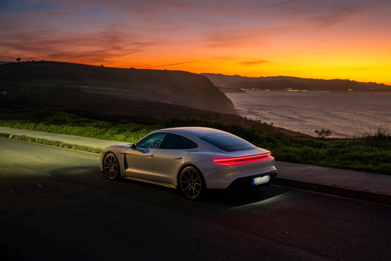 Vista del interior de un Porsche con un hermoso atardecer de fondo.