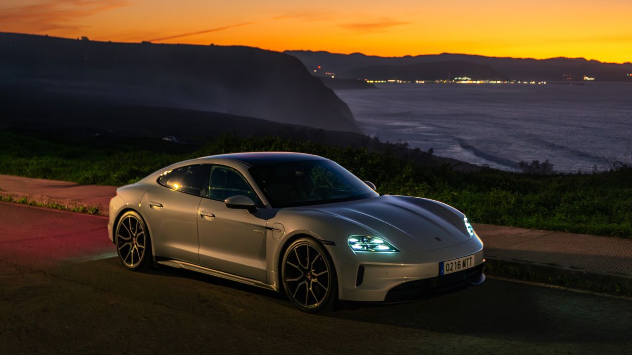 La imagen muestra el interior de un coche Porsche, iluminado con luces rojas. A través del parabrisas se puede ver un impresionante atardecer, creando un ambiente acogedor y elegante. Los detalles del tablero y la tecnología moderna son destacados en esta toma.