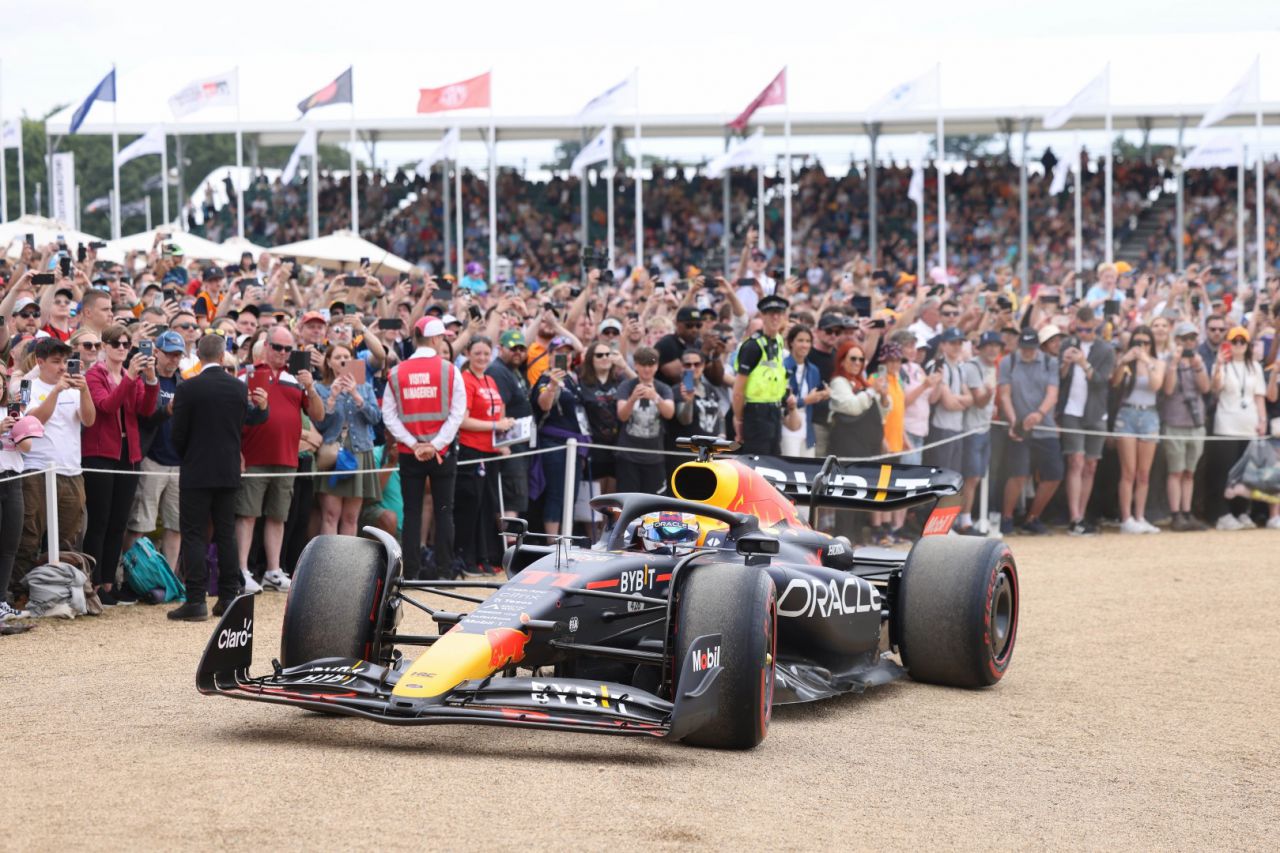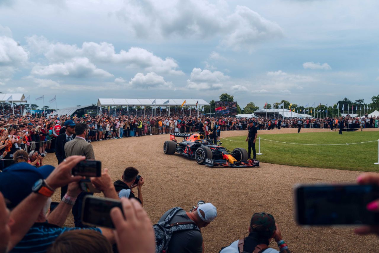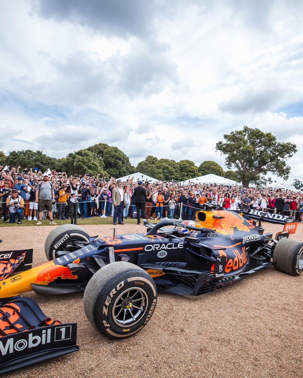 En esta imagen, un piloto de Red Bull F1 se encuentra en un evento rodeado de su equipo y una multitud de fanáticos. El ambiente es vibrante, con cámaras y espectadores emocionados capturando el momento. La atención se centra en el piloto y su coche, destacando la popularidad de la Fórmula 1.