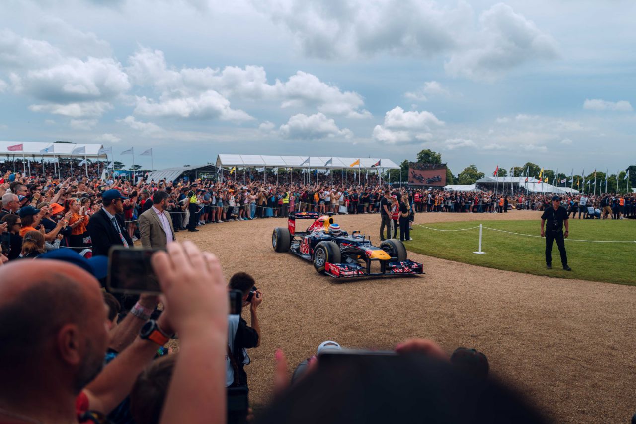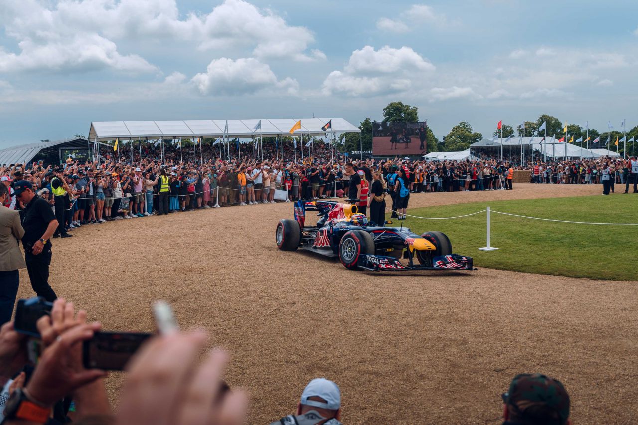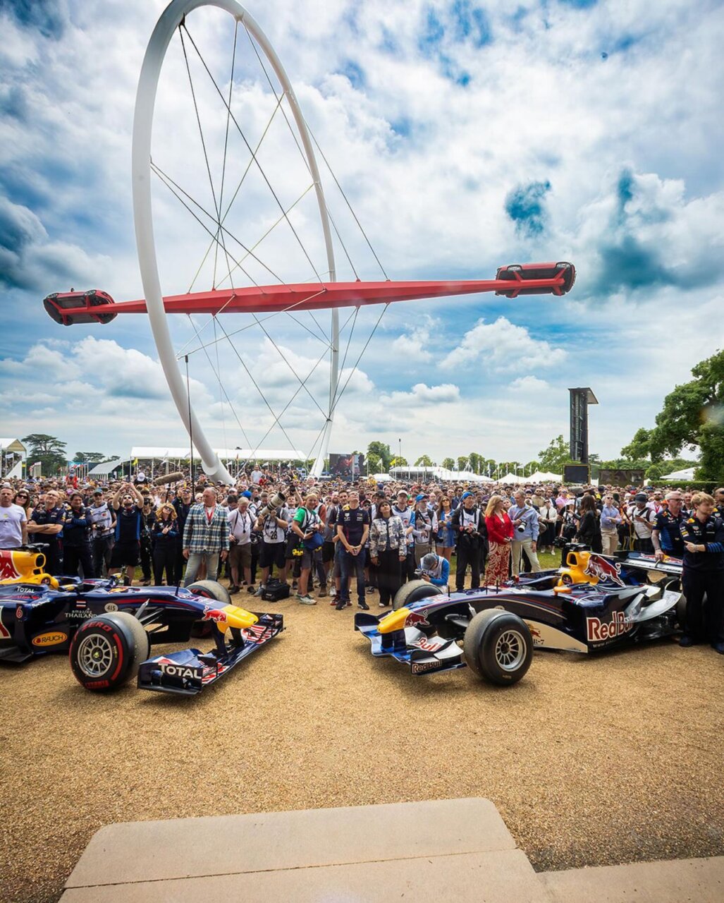 En esta imagen, un piloto de Red Bull F1 se encuentra en un evento rodeado de su equipo y una multitud de fanáticos. El ambiente es vibrante, con cámaras y espectadores emocionados capturando el momento. La atención se centra en el piloto y su coche, destacando la popularidad de la Fórmula 1.