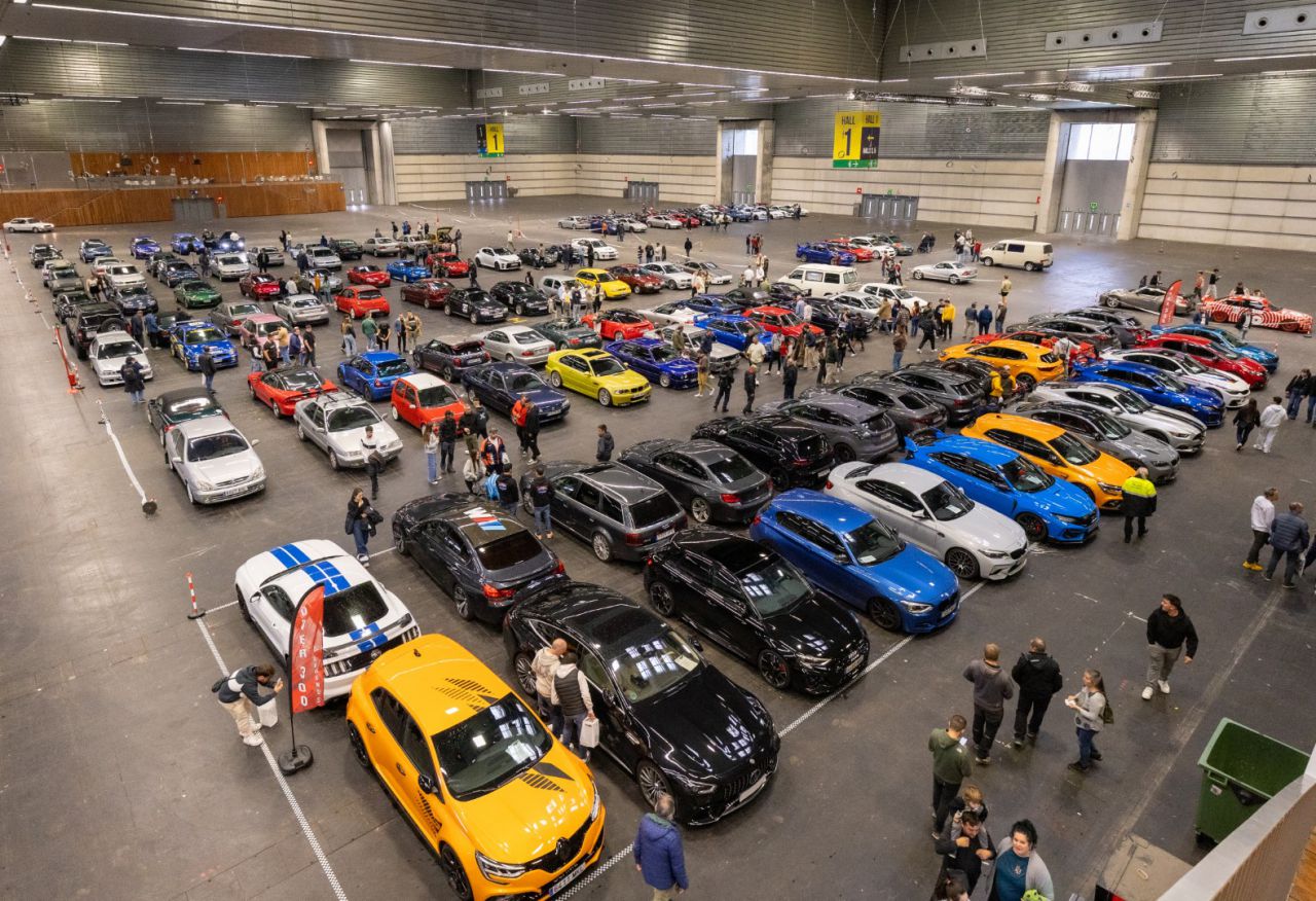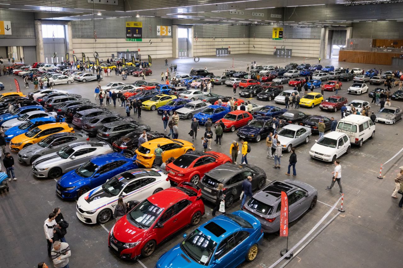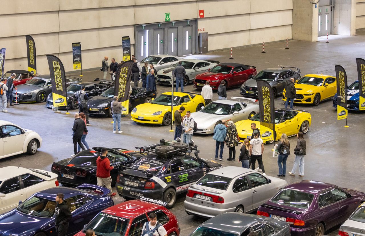 La imagen muestra una exhibición de coches deportivos en un recinto cerrado. Se pueden ver diferentes modelos y marcas, así como asistentes que observan y comentan sobre los vehículos. Las banderas de los patrocinadores añaden un toque vibrante al ambiente del evento.