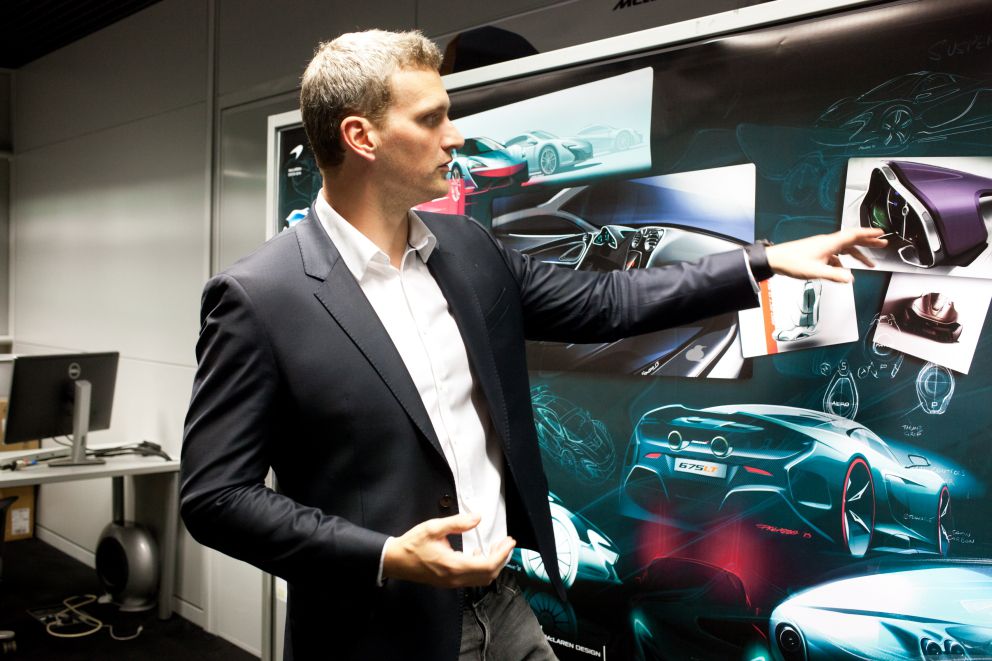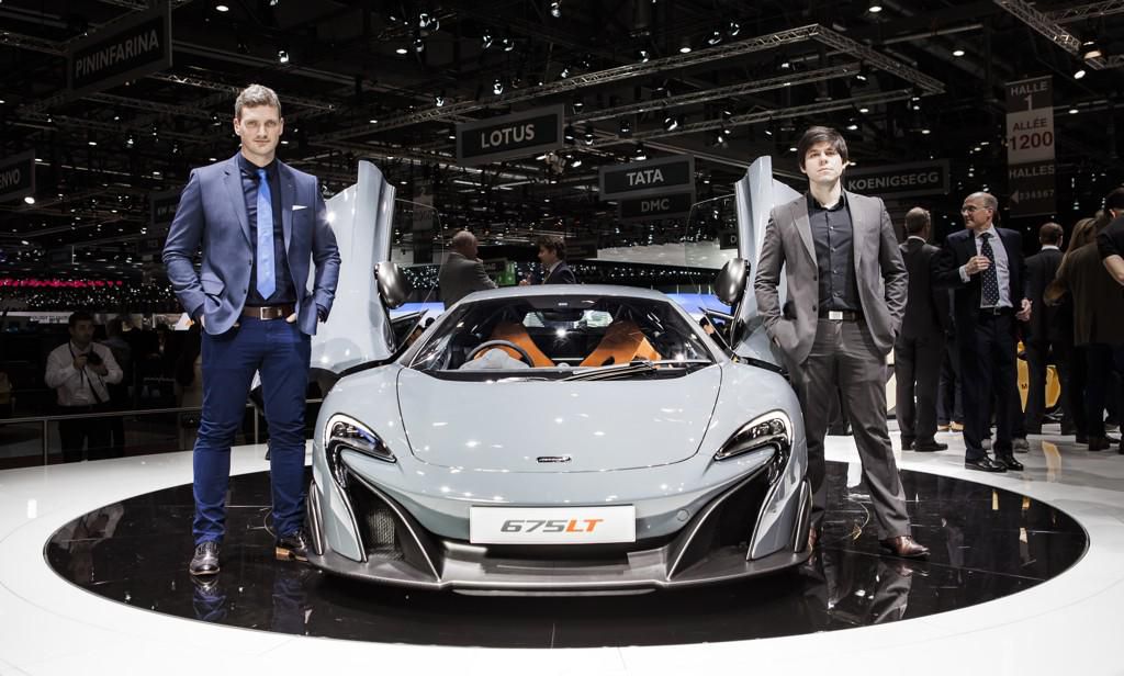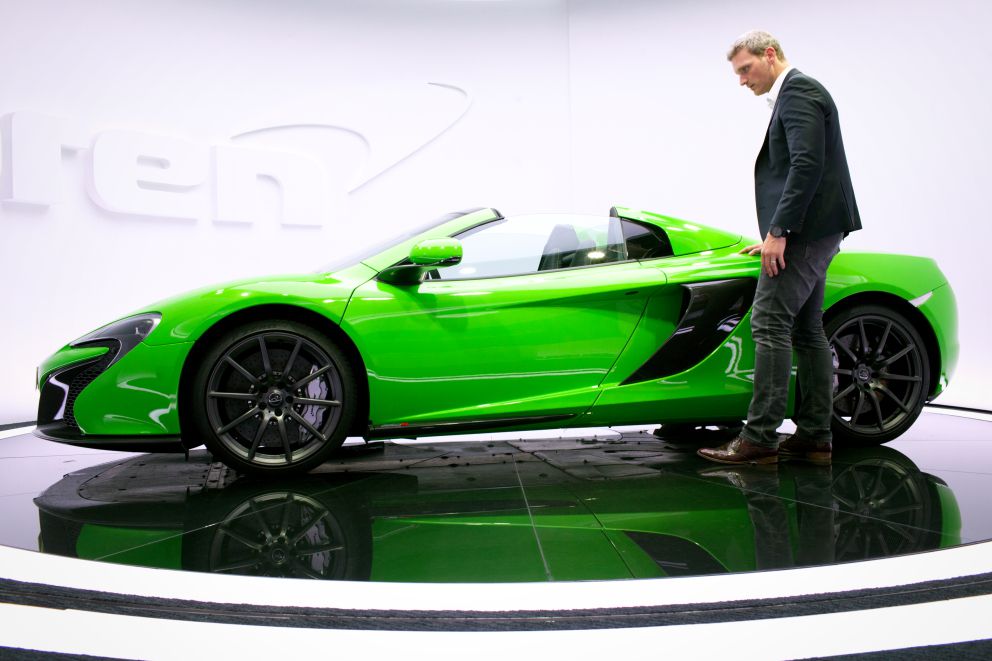 La imagen muestra un automóvil deportivo McLaren de color verde brillante, exhibido en un evento. Un hombre se inclina para observar el vehículo, resaltando su diseño aerodinámico y moderno. La exhibición destaca la elegancia y la potencia del automóvil, atrayendo a los entusiastas del automovilismo.