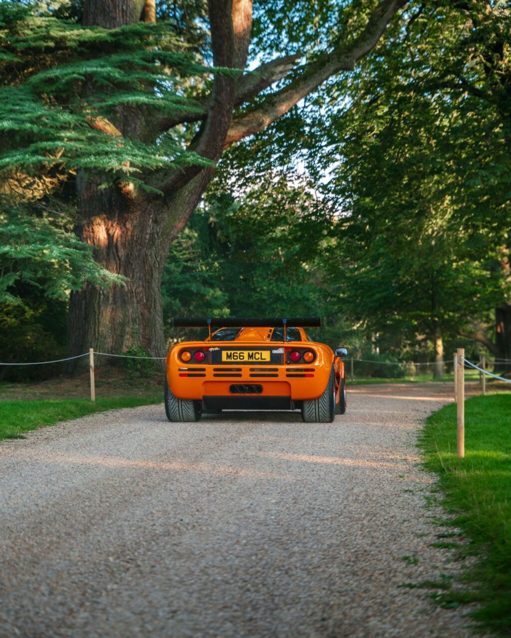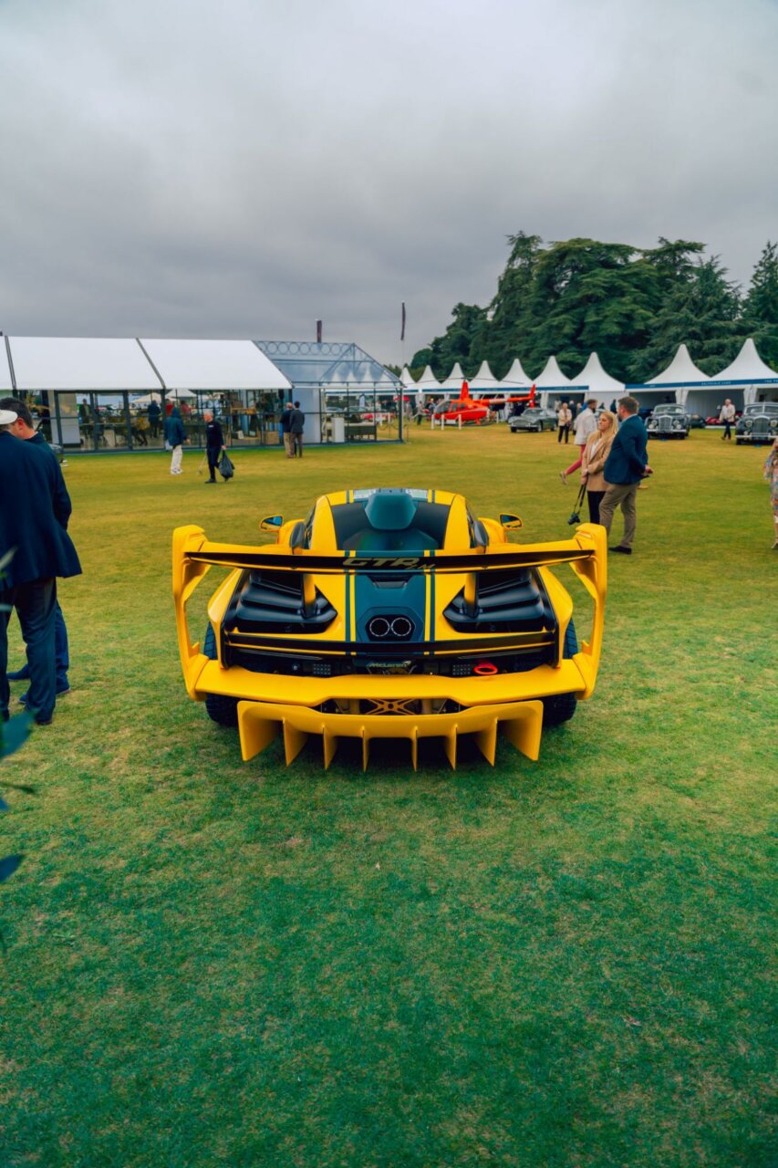 La imagen muestra un McLaren F1 de color naranja en un evento al aire libre, rodeado de un entorno elegante. Se puede ver una majestuosa edificación clásica detrás, lo que realza la belleza del coche deportivo. Este evento destaca por su atmósfera sofisticada y la presencia de otros vehículos de lujo.