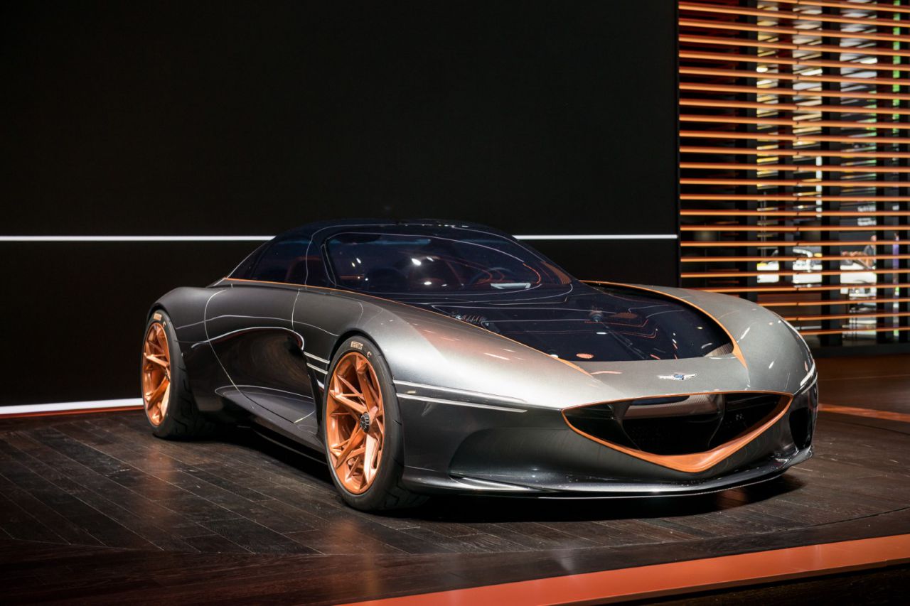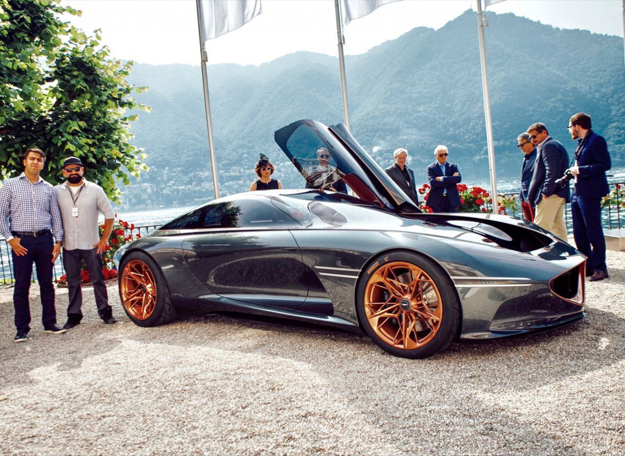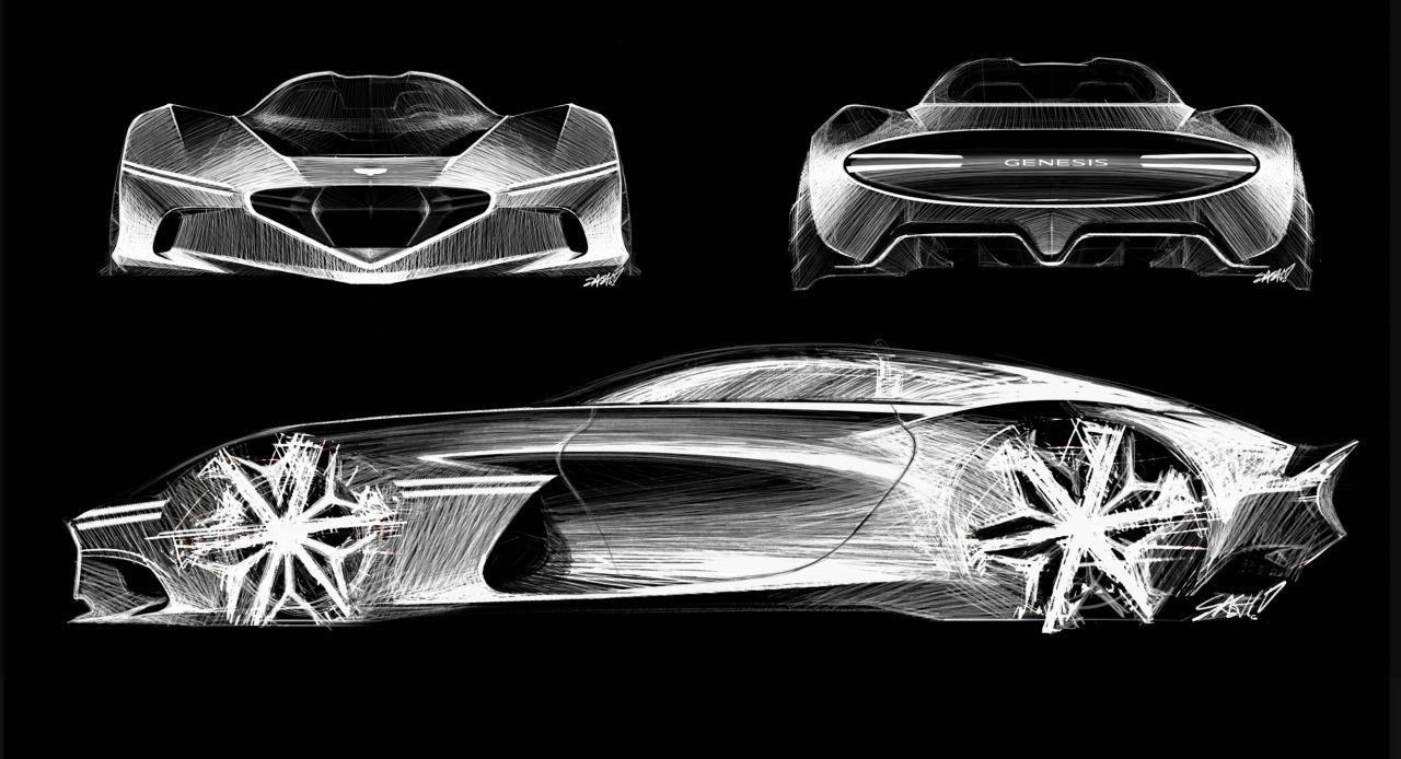 El boceto presenta un diseño conceptual de automóvil, destacando su forma aerodinámica y detalles estilísticos. Se pueden observar las vistas lateral y trasera, lo que permite apreciar la creatividad del diseño automotriz. Este tipo de ilustraciones es fundamental en el proceso de desarrollo de vehículos.