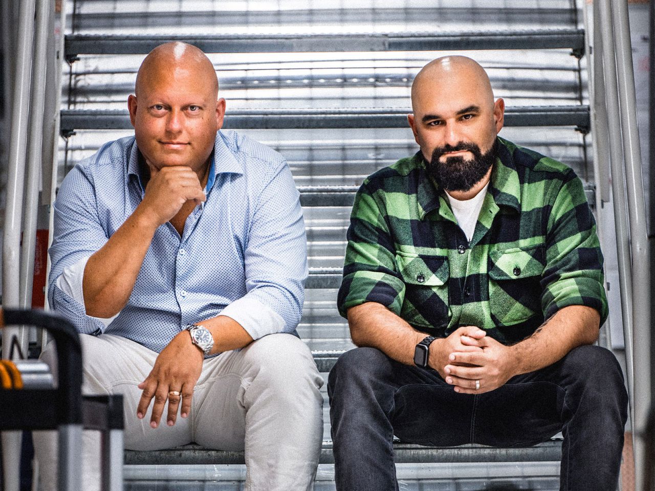 Dos hombres posando en una escalera, mostrando un ambiente relajado y profesional.