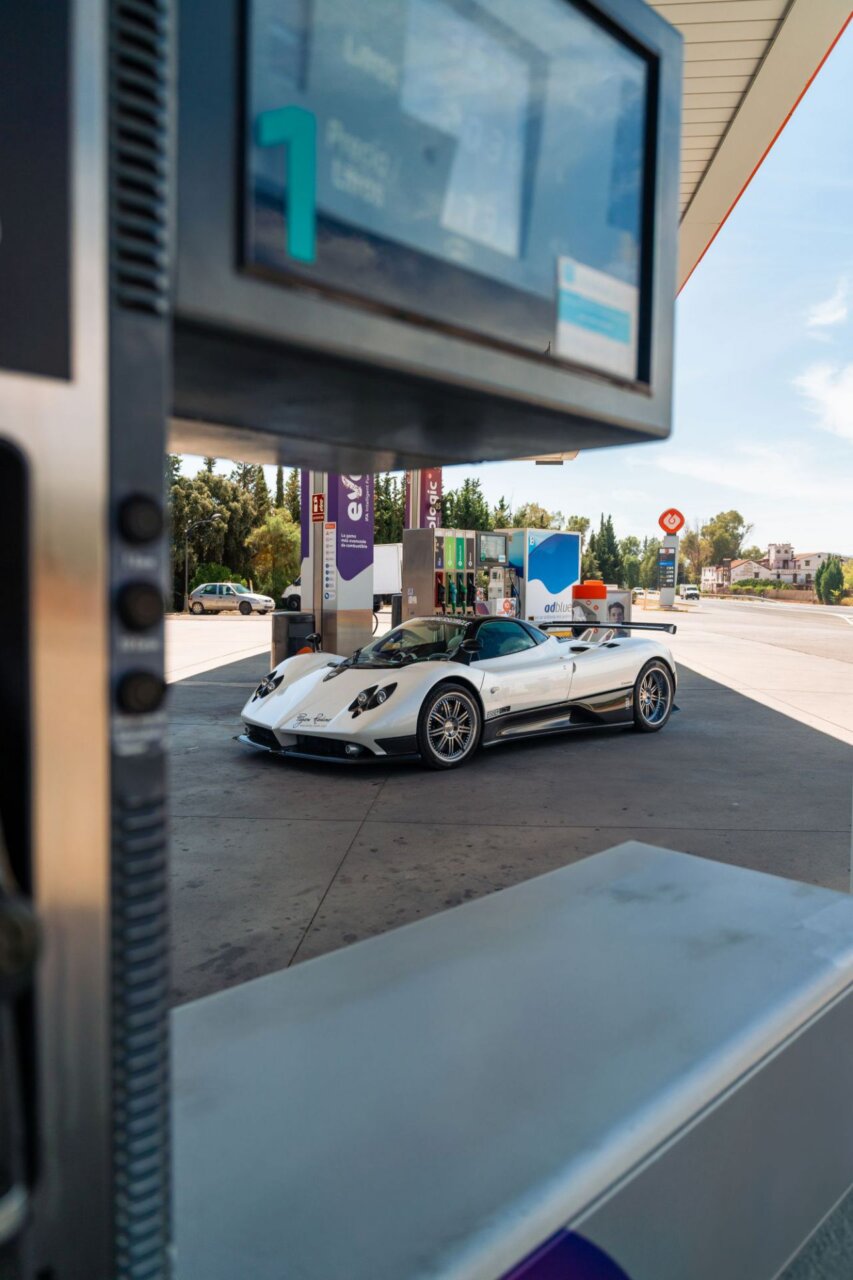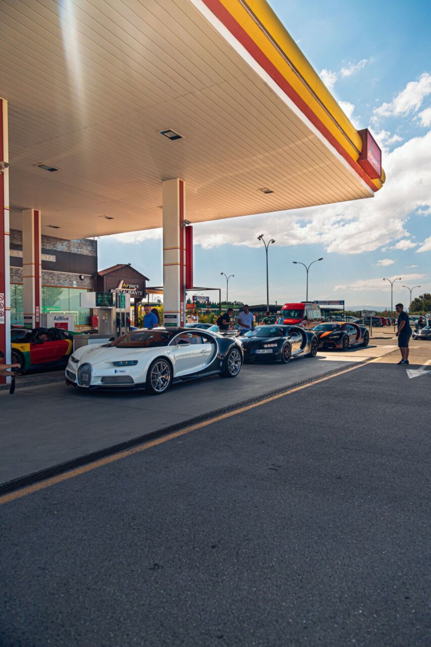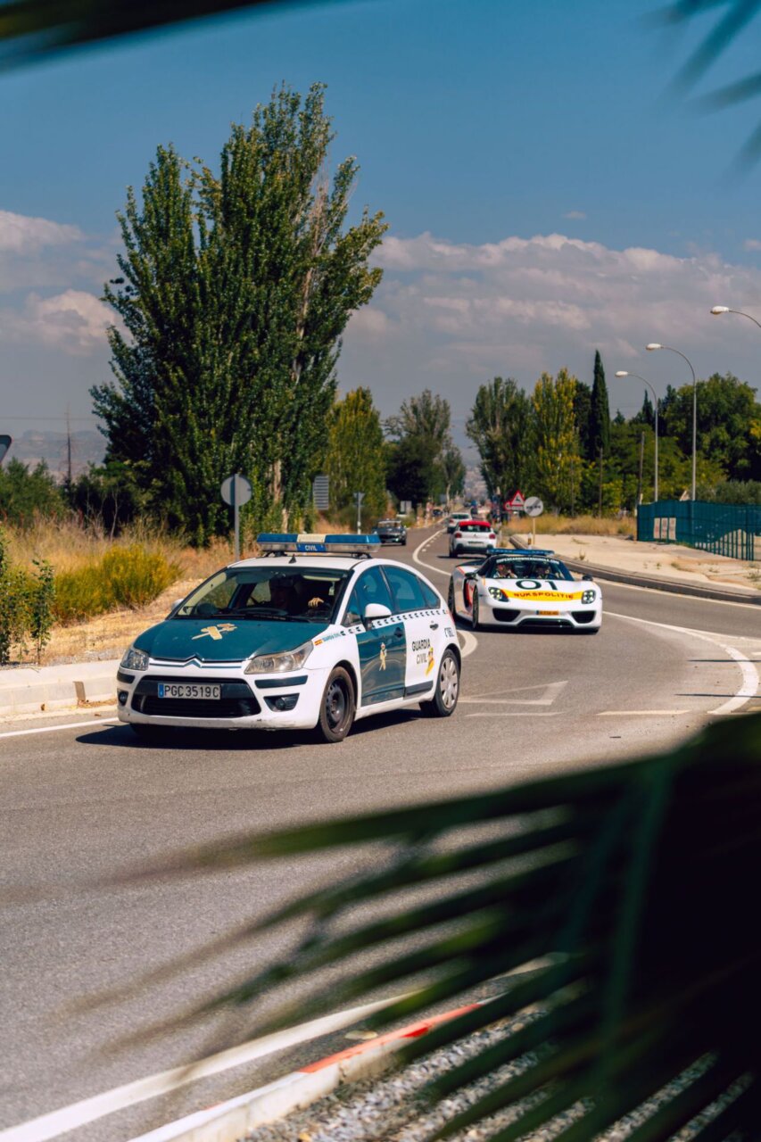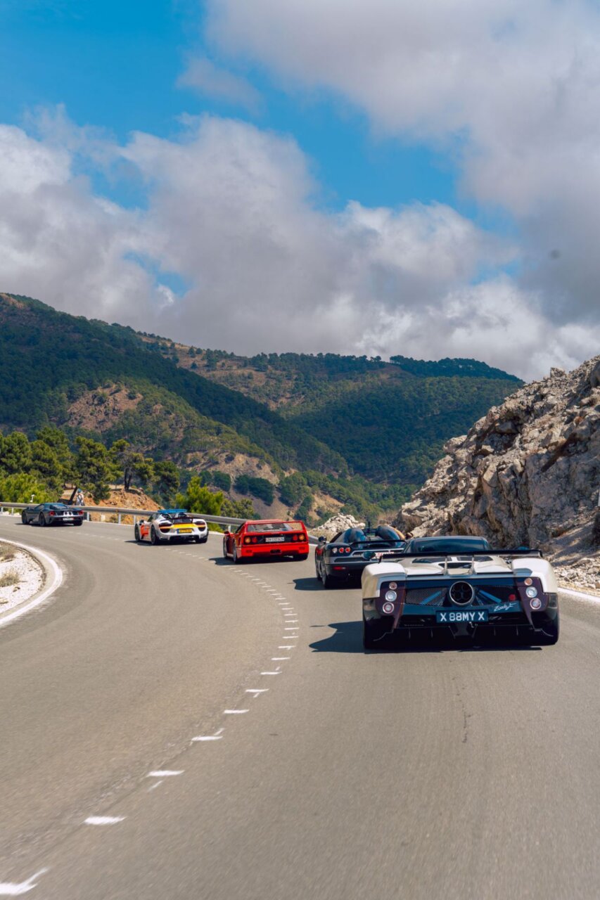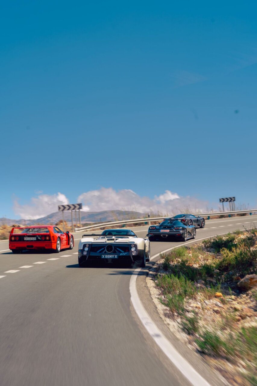 La imagen muestra varios coches deportivos, incluyendo un modelo blanco y uno rojo, en una carretera curva. El paisaje es montañoso y el cielo está despejado, lo que añade un toque vibrante a la escena. Esta captura resalta la velocidad y el diseño de estos vehículos de alto rendimiento.