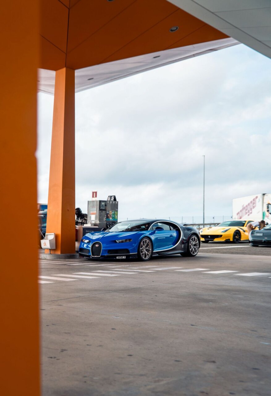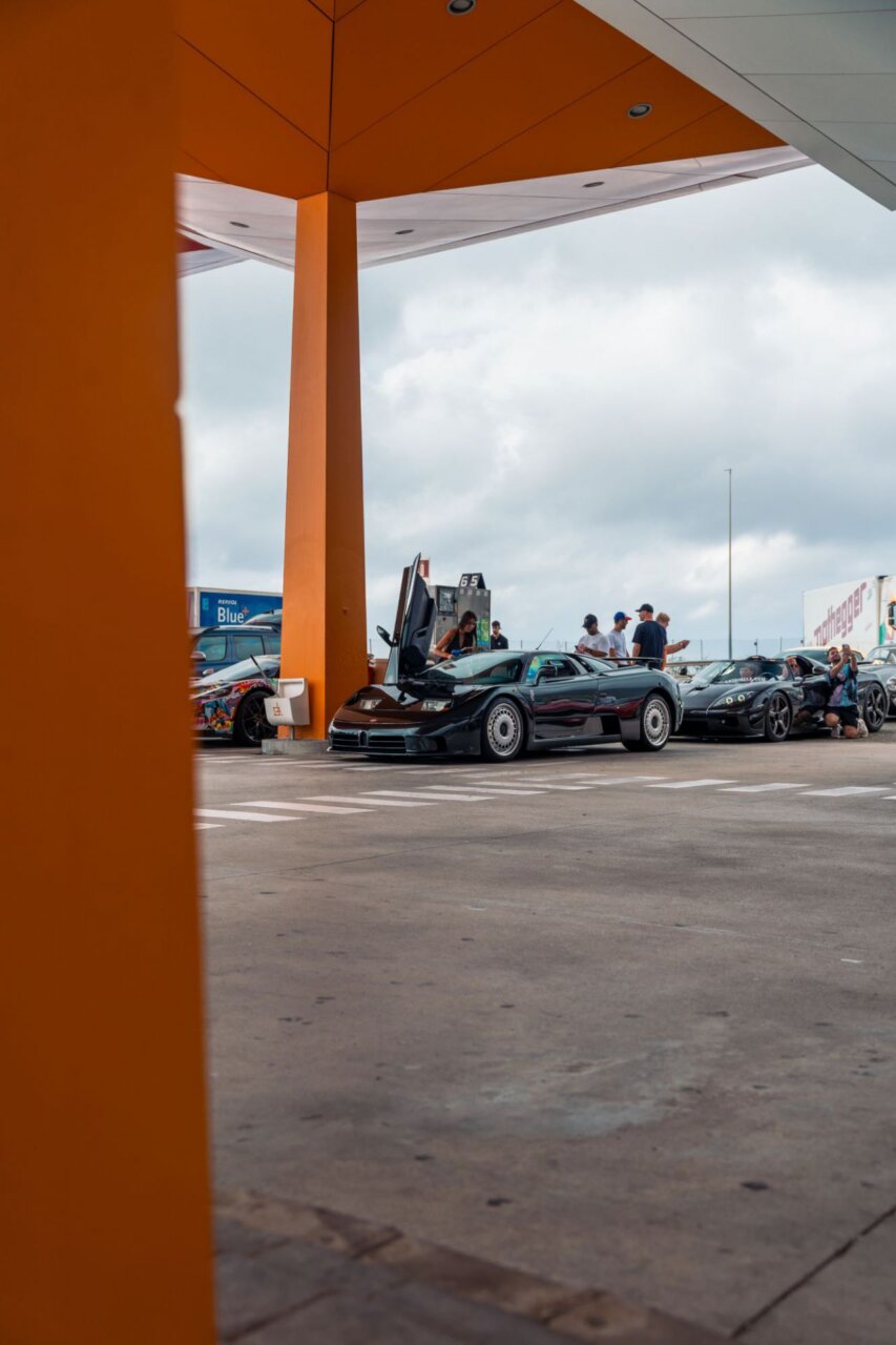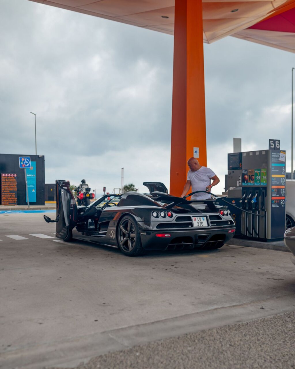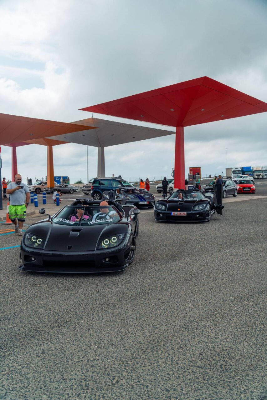 La imagen muestra un elegante Koenigsegg negro en una gasolinera. Este automóvil deportivo destaca por su diseño aerodinámico y puertas que se abren hacia arriba. En el fondo, se pueden ver otros vehículos y un ambiente de estación de servicio, lo que resalta la fusión entre lujo y cotidianidad.