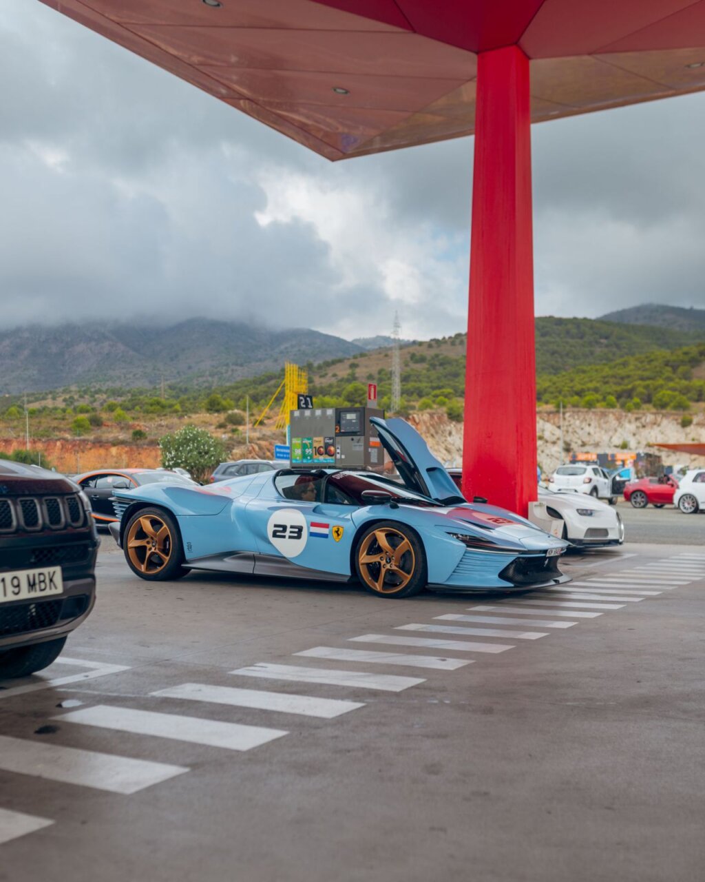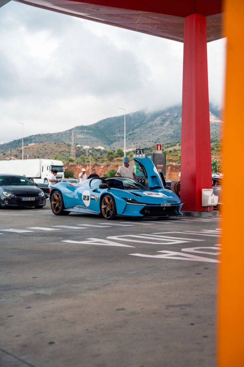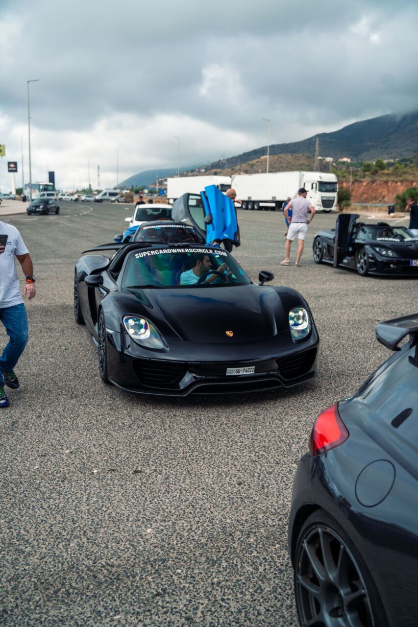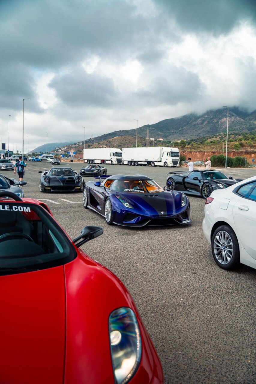 La imagen muestra un elegante Koenigsegg negro en una gasolinera. Este automóvil deportivo destaca por su diseño aerodinámico y puertas que se abren hacia arriba. En el fondo, se pueden ver otros vehículos y un ambiente de estación de servicio, lo que resalta la fusión entre lujo y cotidianidad.