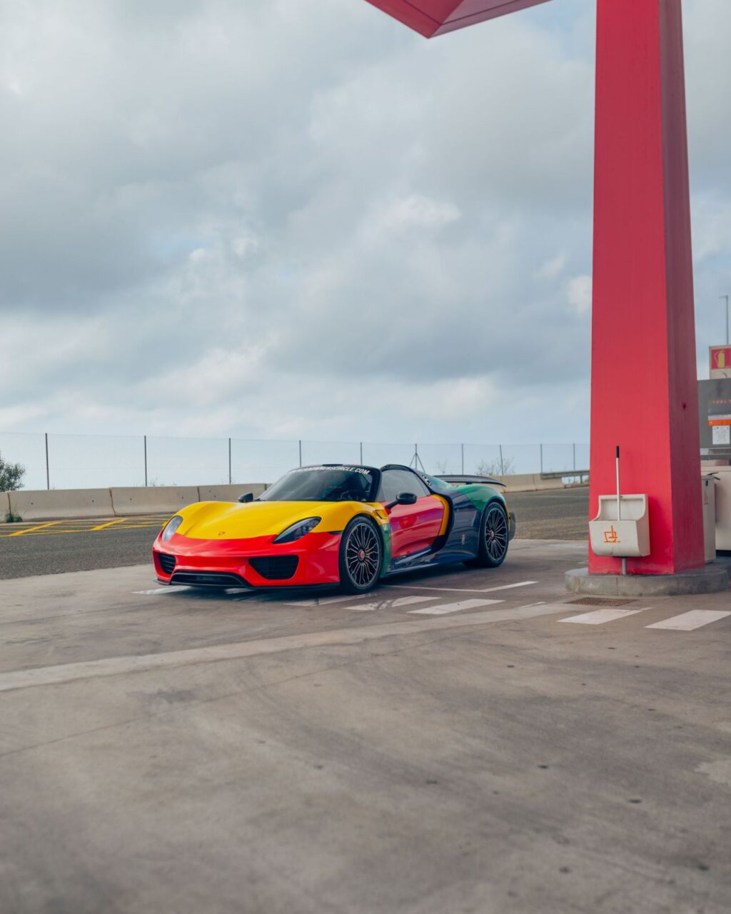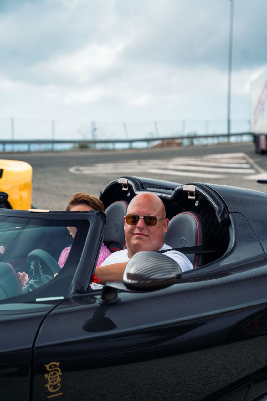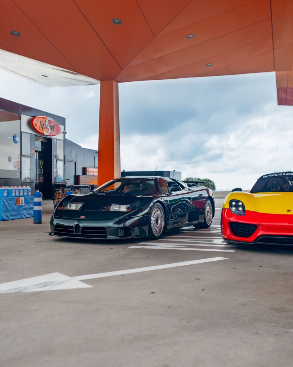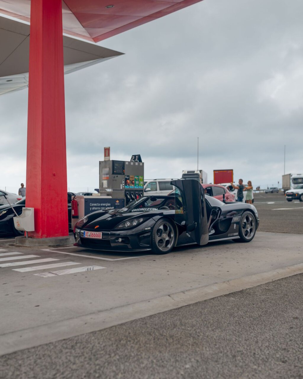 Un impresionante Koenigsegg negro en una gasolinera moderna. Las puertas están abiertas, mostrando su diseño exclusivo.