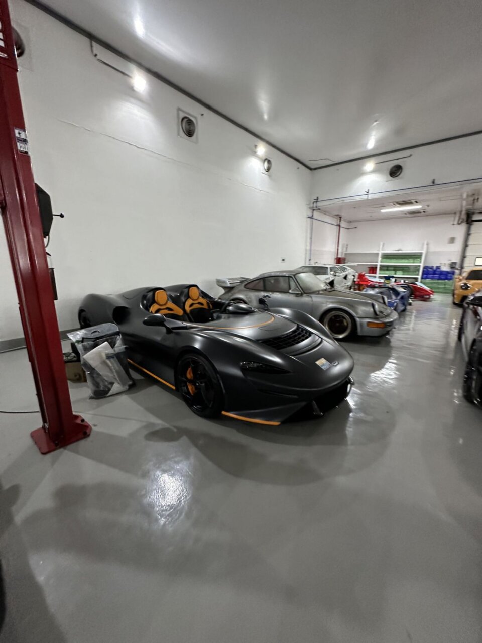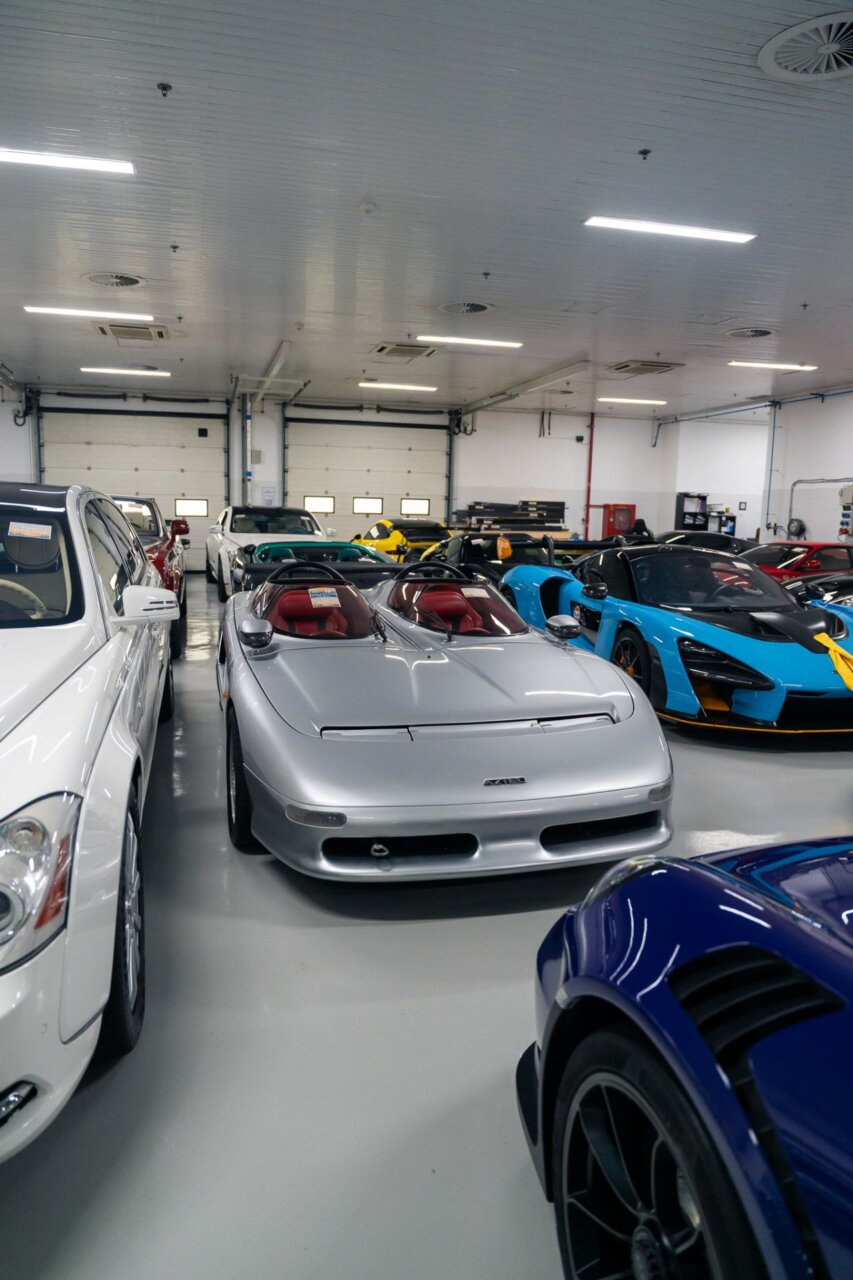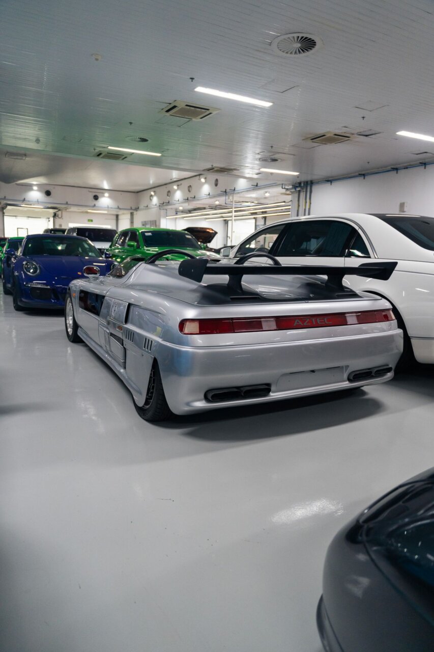 La imagen muestra un automóvil plateado con un diseño aerodinámico y alerón trasero, estacionado en un garaje. Al fondo, se pueden ver varios coches de diferentes colores, creando un ambiente vibrante y dinámico. Este tipo de vehículos son apreciados por los entusiastas del automovilismo.