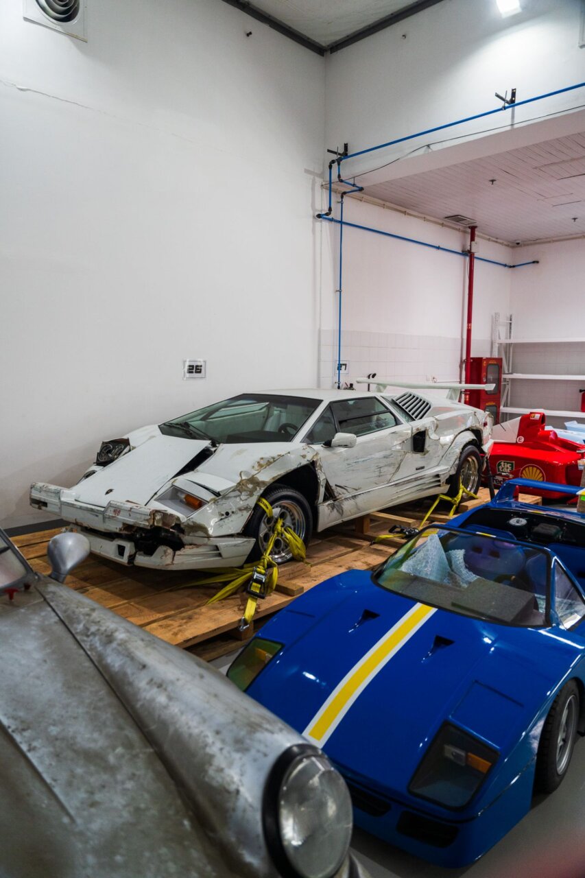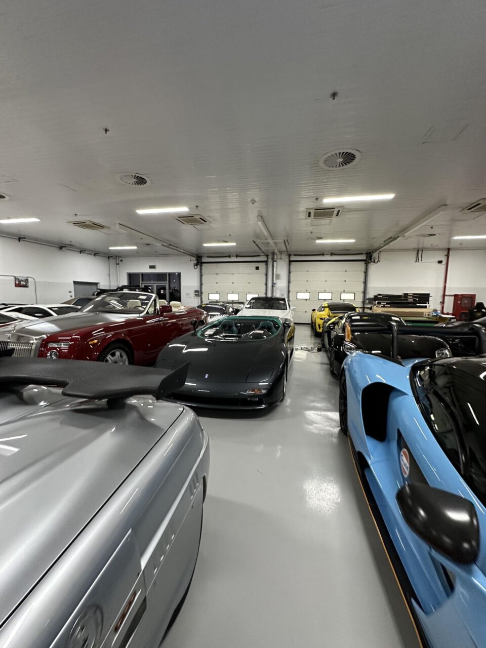 Un impresionante automóvil plateado se destaca en un garaje lleno de vehículos.