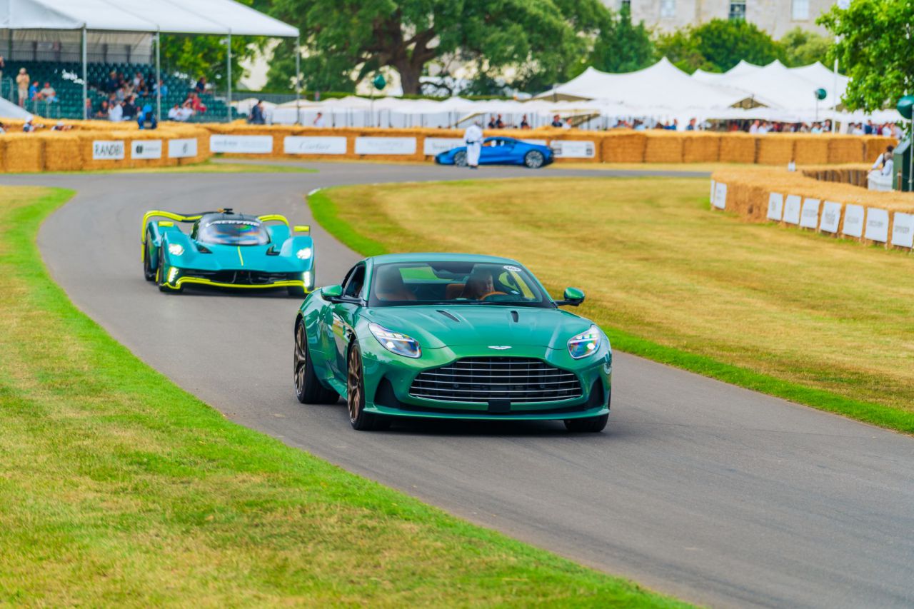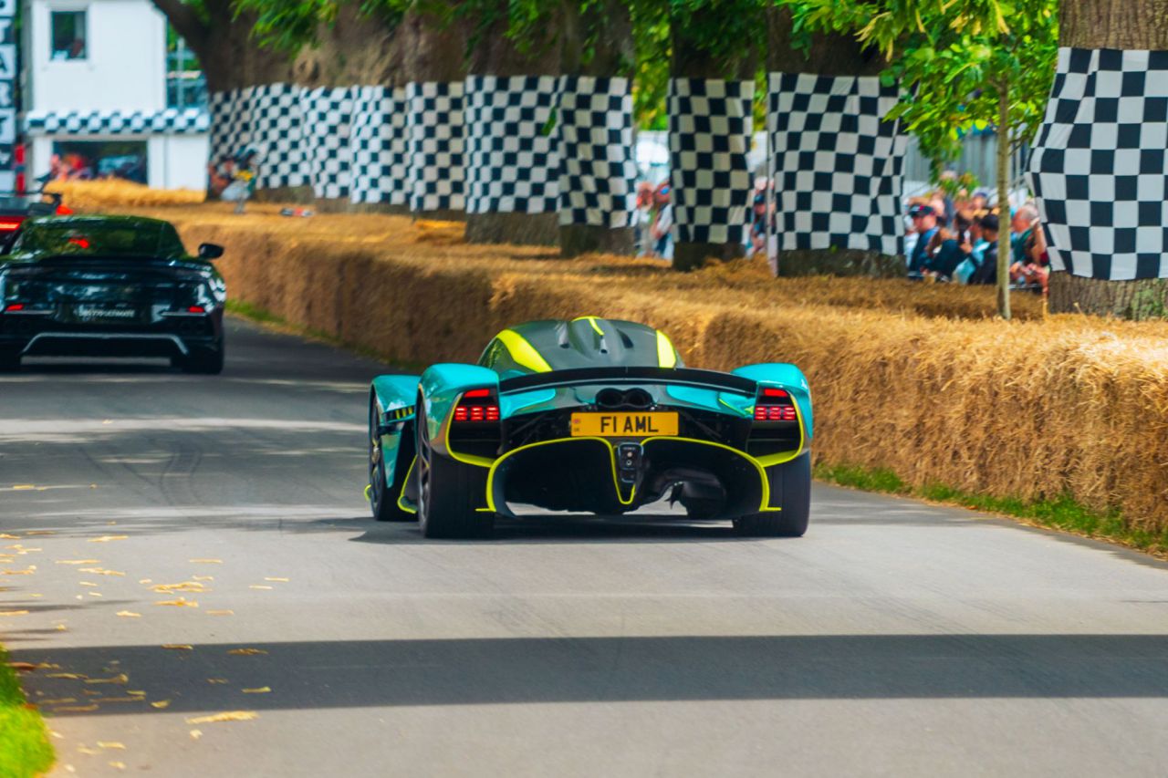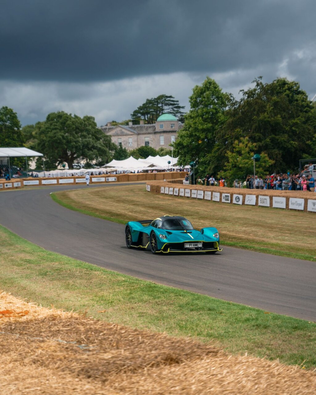 La imagen muestra un coche deportivo de alto rendimiento en el Festival de Goodwood, conocido por sus emocionantes carreras y exhibiciones de automóviles. El vehículo destaca por su diseño aerodinámico y colores vibrantes, mientras avanza por un camino rodeado de espectadores y decoraciones de carrera.