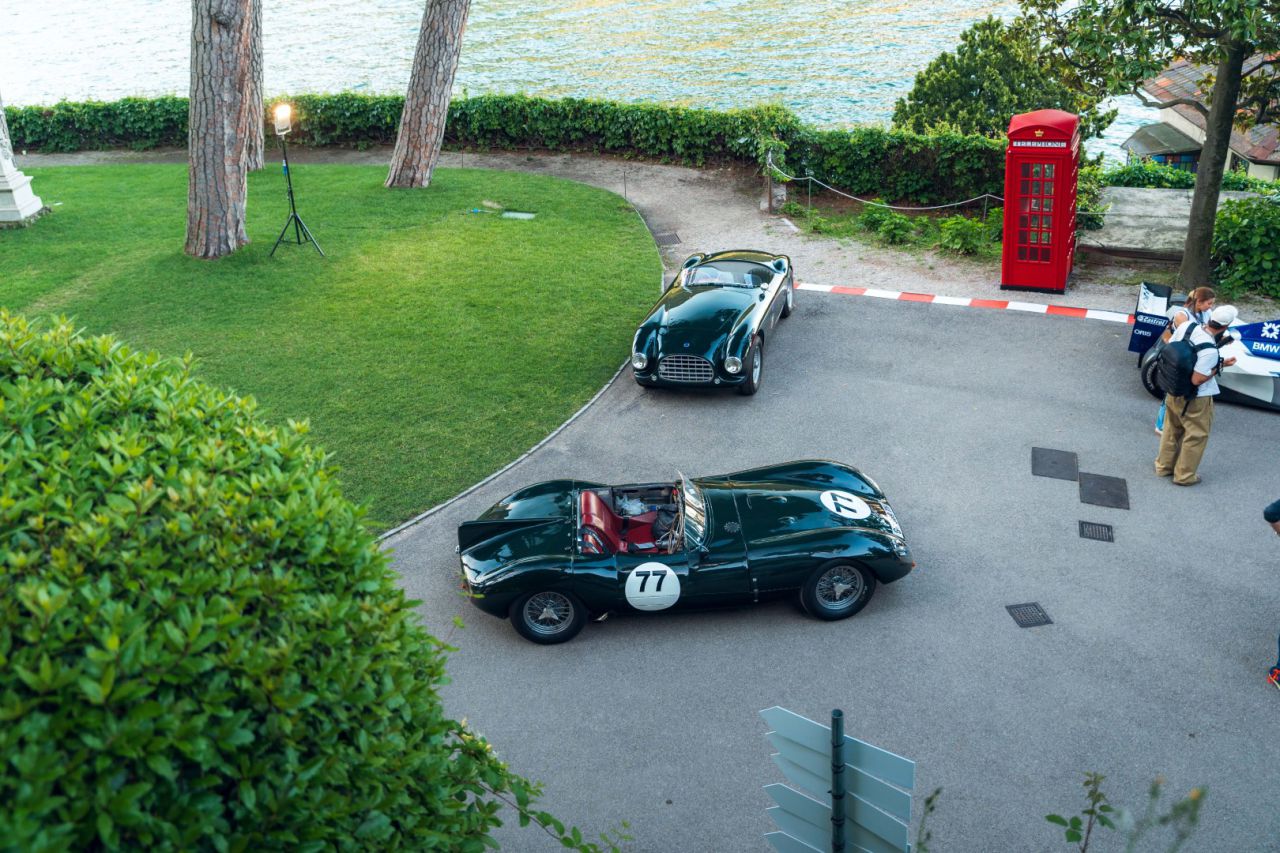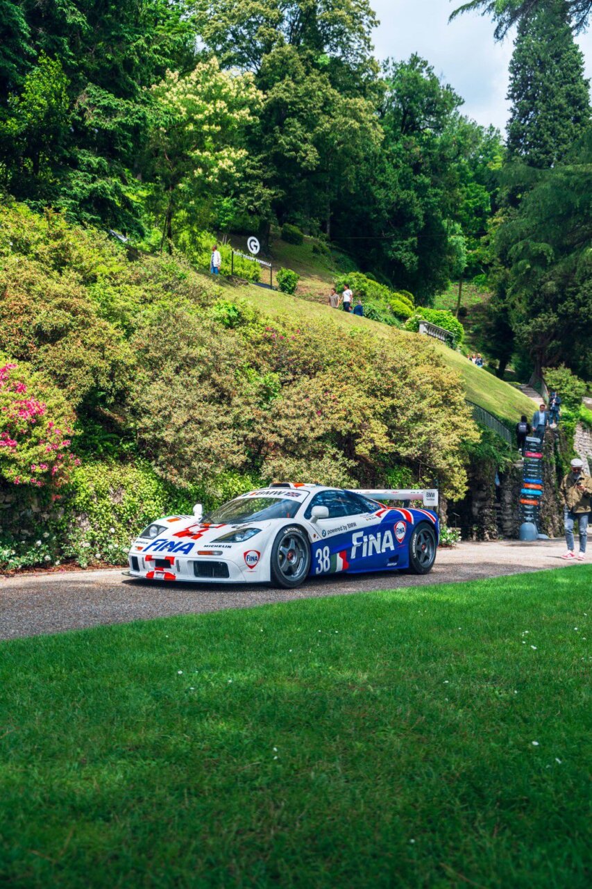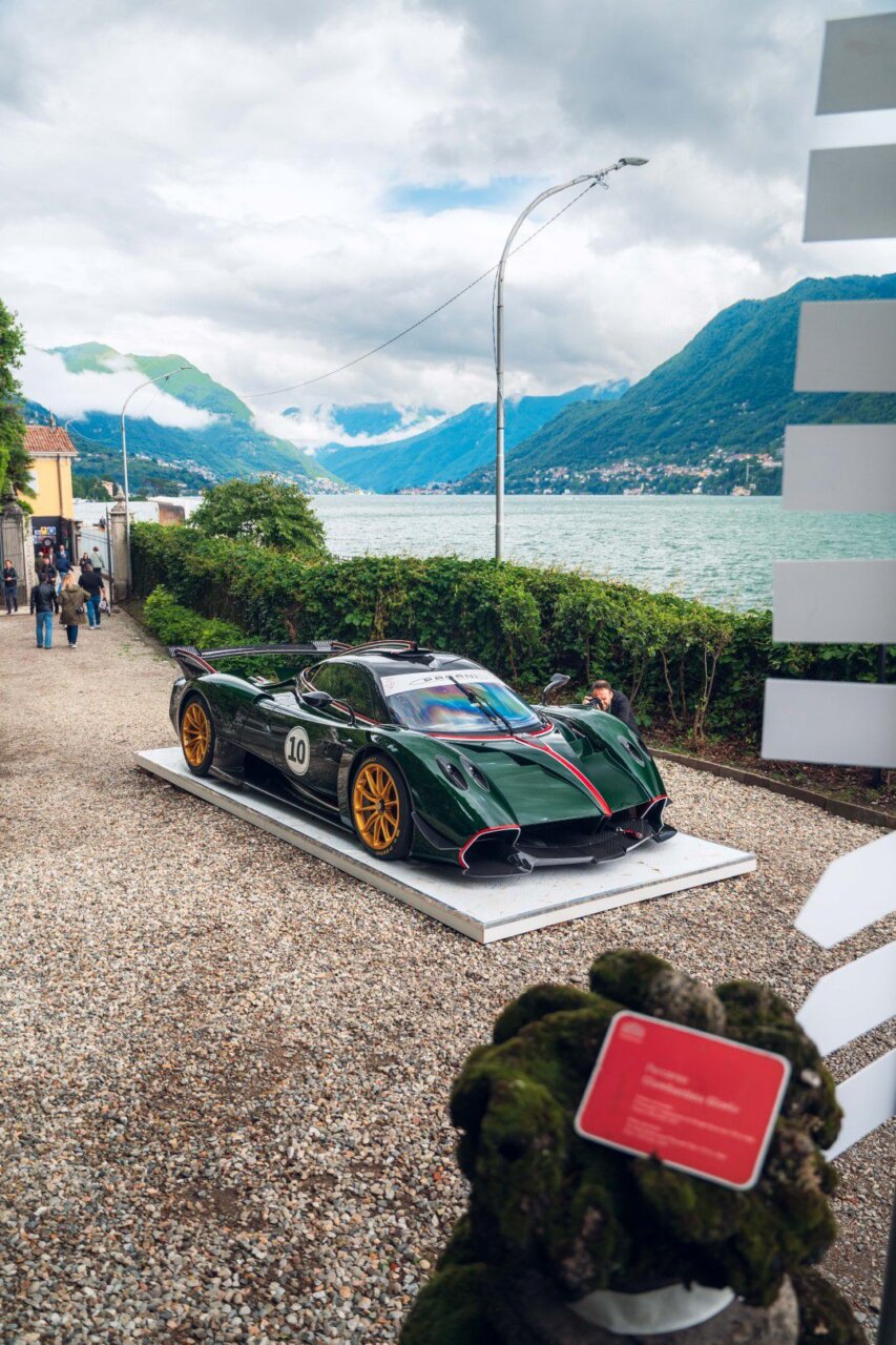 La imagen muestra un Pagani Zonda, un coche deportivo de lujo, exhibido junto a un lago rodeado de montañas. El vehículo, con un diseño elegante y distintivo, atrae la atención de los visitantes que pasean por el área. Este escenario combina la ingeniería automotriz con la belleza natural, creando una experiencia visual única.
