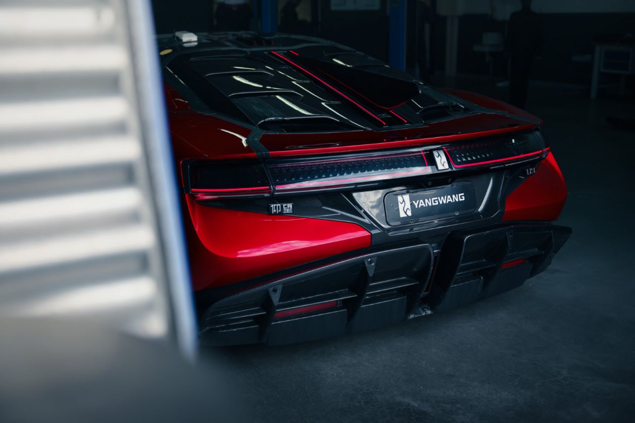 La imagen muestra la parte trasera de un coche deportivo Yangwang de color rojo, destacando su diseño aerodinámico y moderno. El vehículo está en un taller, lo que sugiere un enfoque en la mecánica y el rendimiento. Los detalles del diseño, como las luces traseras y el alerón, son claramente visibles, reflejando la calidad y la innovación de la marca.