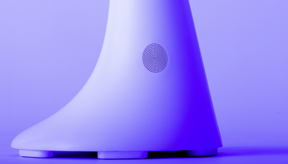 Este altavoz presenta un diseño elegante y minimalista en color blanco, ideal para cualquier espacio moderno. La iluminación azul resalta su forma única, convirtiéndolo en un elemento decorativo además de funcional. Perfecto para los amantes de la tecnología y el diseño.