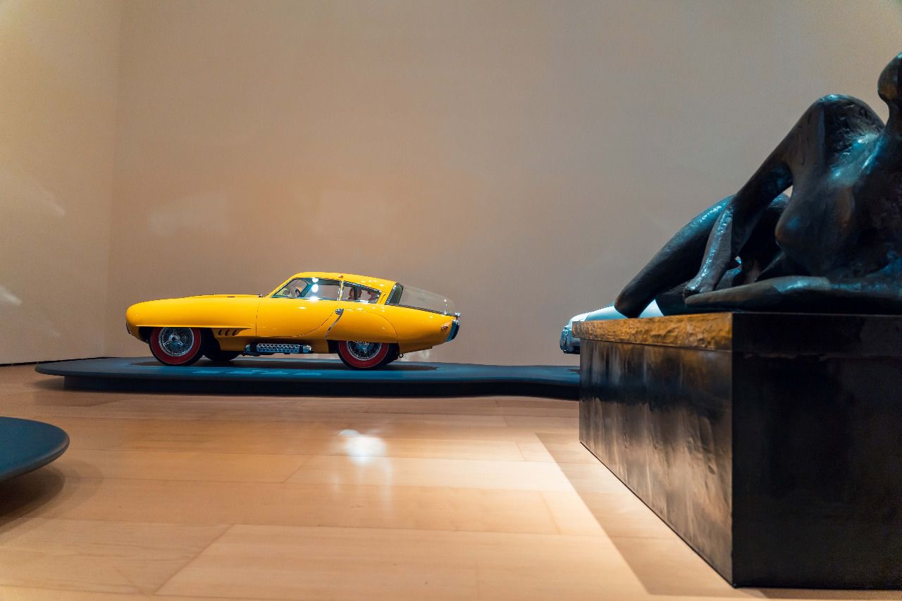 Como el propio nombre de la sala indica, entre los cuatro coches se dispone una escultura de una figura recostada obra del escultor Henry Moore.