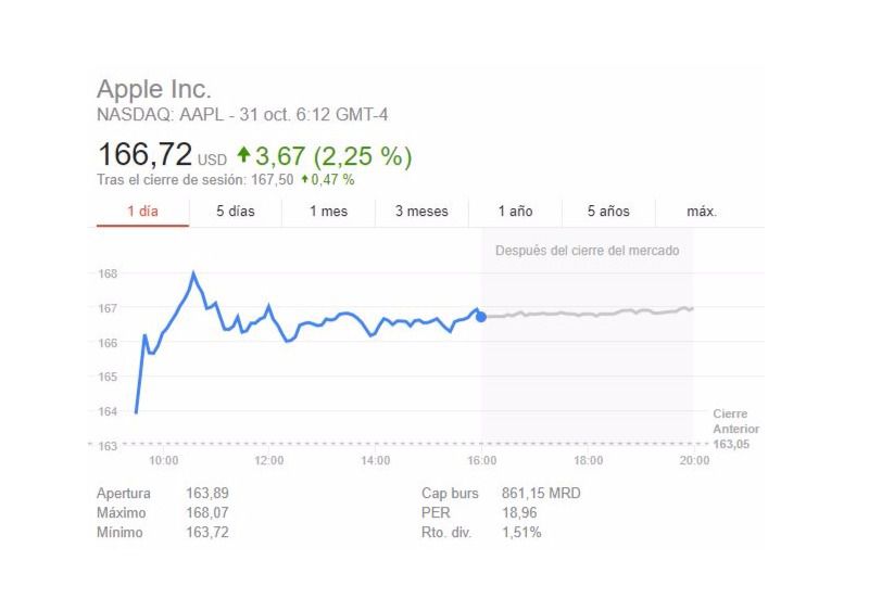 Las acciones de Apple han subido en la Bolsa de Nueva York en un 2,4% debido en parte al lanzamiendo del iPhone X. Lo que supone un máximo histórico de 166.72 dólares por unidad y una capitalización de 861,147 millones de dólares.