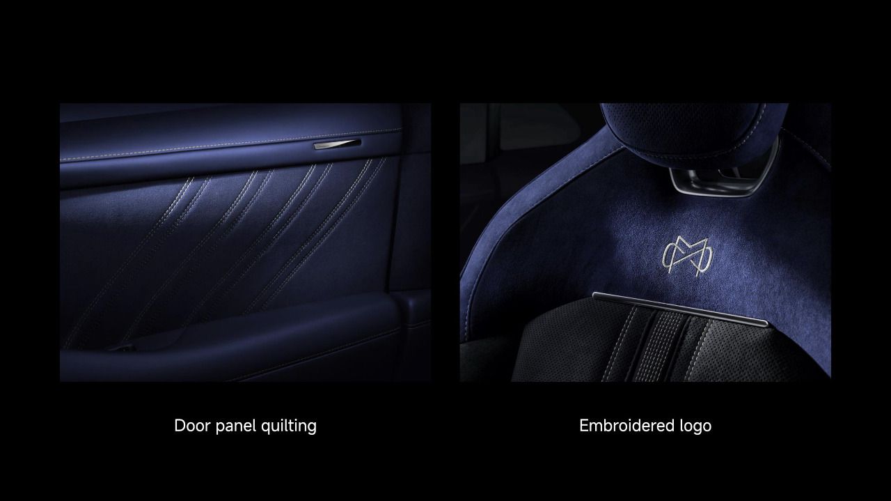 Los asientos introducen acolchado con patrón inspirado en la alta costura y una cinta de pespunte ejecutada con técnica síncrona de siete agujas y paso de 1/8″, que se replica en paneles de puerta con tolerancias muy ajustadas. El bordado del logotipo, 1862 puntadas, dibuja el motivo “M + ∞”, síntesis de personalización e identidad.
